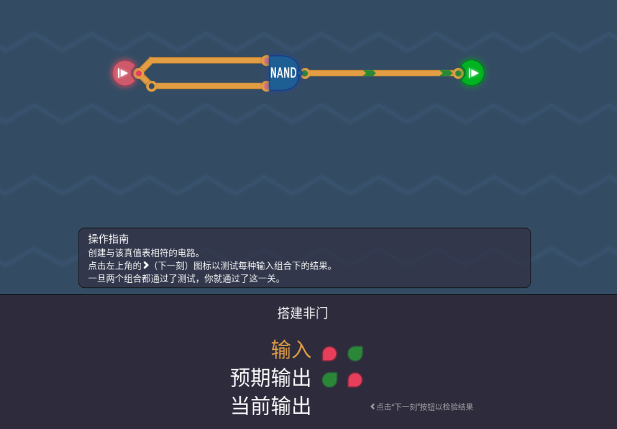 与非门的真值表是 1110,所以只需要将单端的输入连上与非门的两个引脚,输入 00 与 输入 11 所对应的结果是 1 与 0,效果和非门相同