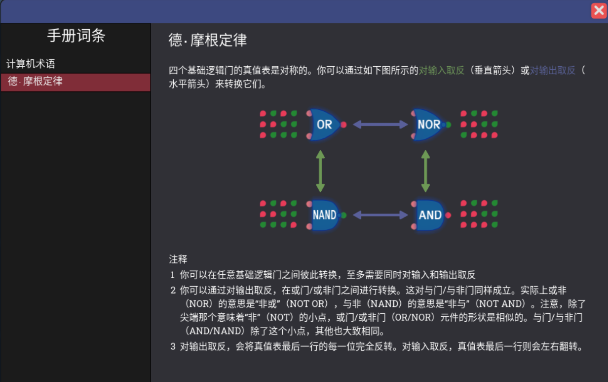 德摩根定理,在某个电路输入那串上非门,那输入序列顺序就会置反,使得真值表水平翻转,在某个电路输出那串上一个非门,输出信息的二进制位会置反